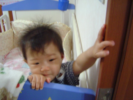 すくっと立ち上がり(捕まり立ち専門のくせに)手を振っている。