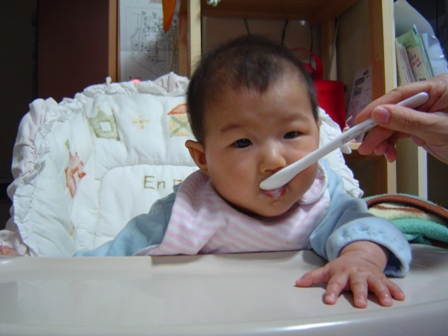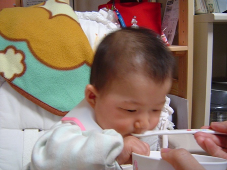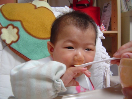 最近、離乳食の初期段階に入ったハナ。