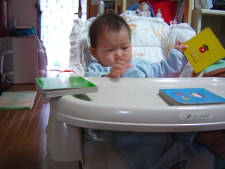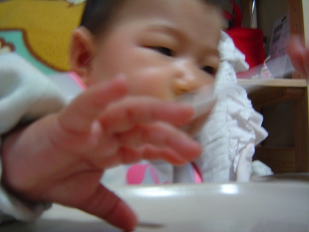ハナは、私のスプーンのタイミングが遅いと、待ちきれずにスタイ(よだれかけ)をチューチュー吸ったりしております。