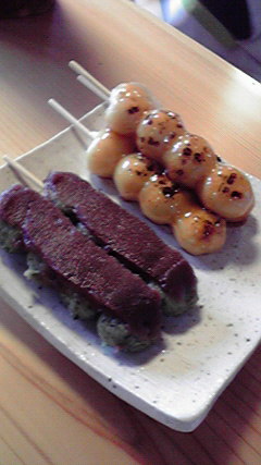 雨宿りをしながら、お団子をほおばりまして。